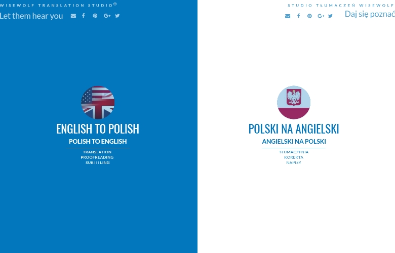 Bardzo lekka strona przedstawiająca ofertę usług tłumaczeniowcyh - dwujęzyczna z ciekawym ekranem wyboru języka oraz stylizowanym designem treści.